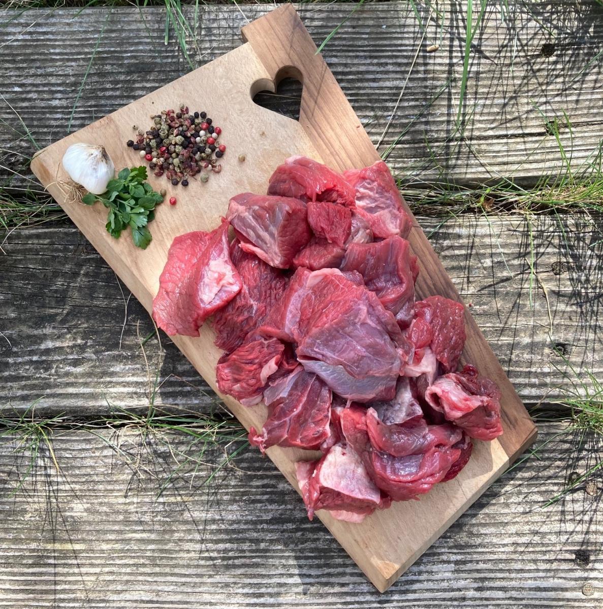Viande à bourguignon, en dés, viande race limousine, agriculture biologique, mis sous-vide. Environ 0.600kg