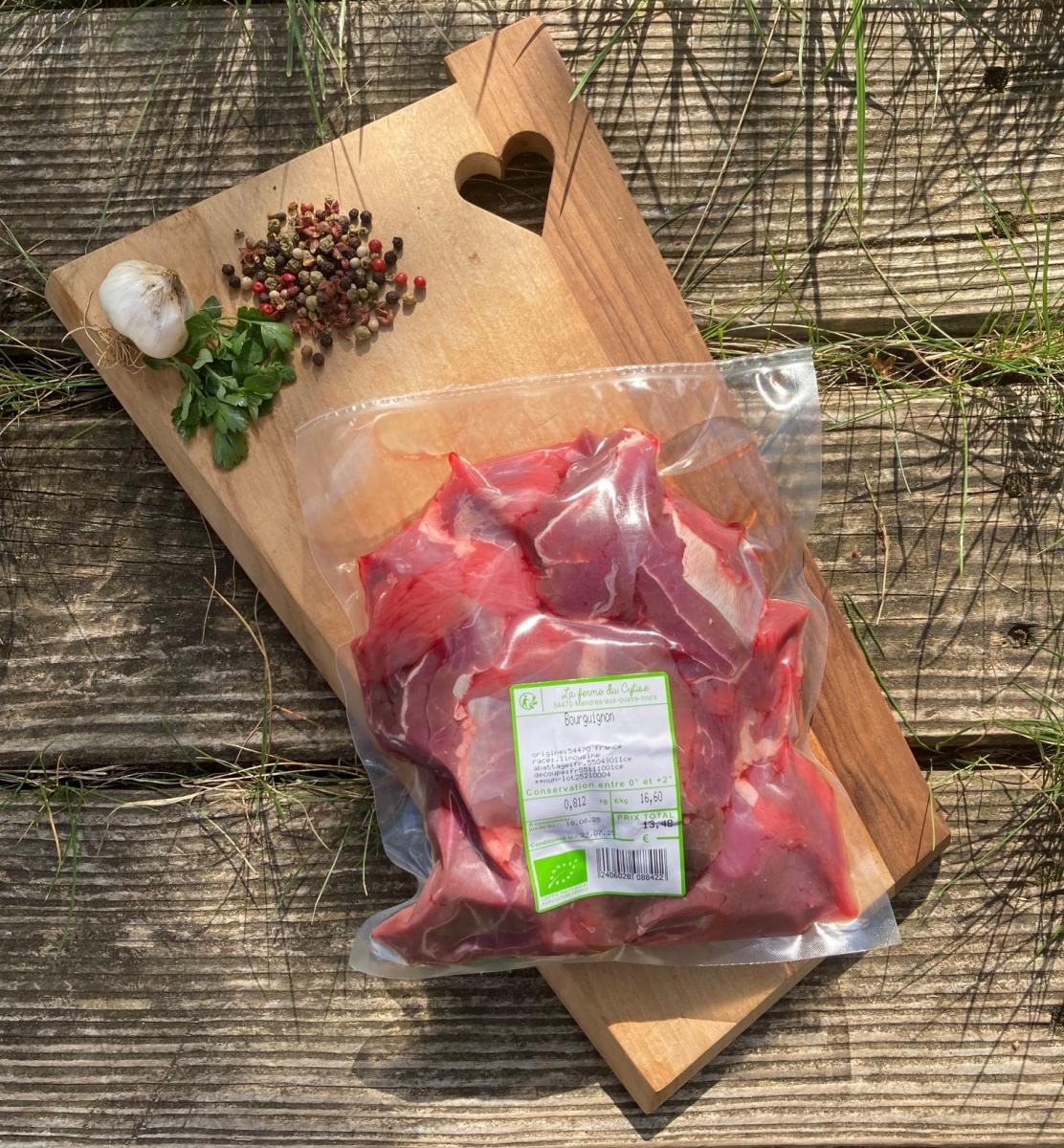 Viande à bourguignon, en dés, viande race limousine, agriculture biologique, mis sous-vide. Environ 800 grammes