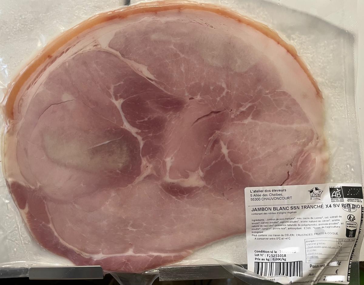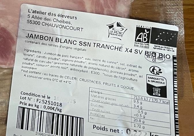 Ingrédients : jambon de porc français, eau, sucre de canne, sel, extrait de levure, caroote poudre, oignons poudre, arome naturel de citron, arome naturel de carcube, poireau poudre, ail poudre, romarin, poivre noir, antioyydant.