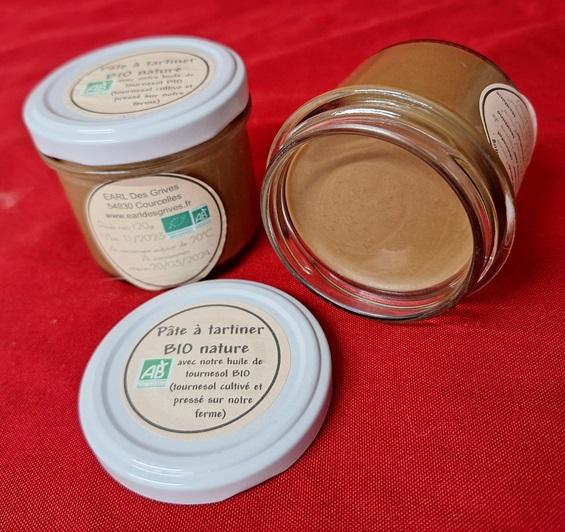 pâte à tartiner nature BIO, fabriqué dans notre laboratoire avec notre huile de tournesol BIO, du praliné et du chocolat au lait,