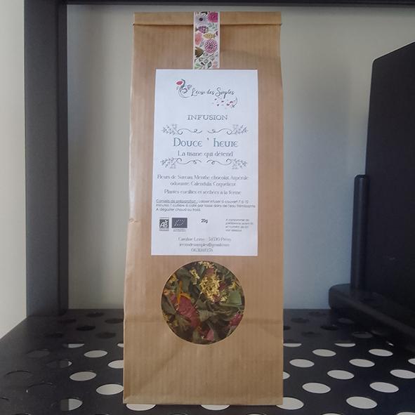 Ingrédients : coquelicot, menthe chocolat, aspécule odorante, soucis, fleurs de sureau