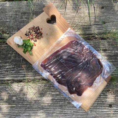 Ingrédients: Viande de porc bio, sel, poivre bio, sucre de canne bio, laurier bio, girofle bio, conservateur: nitrate de potasse.