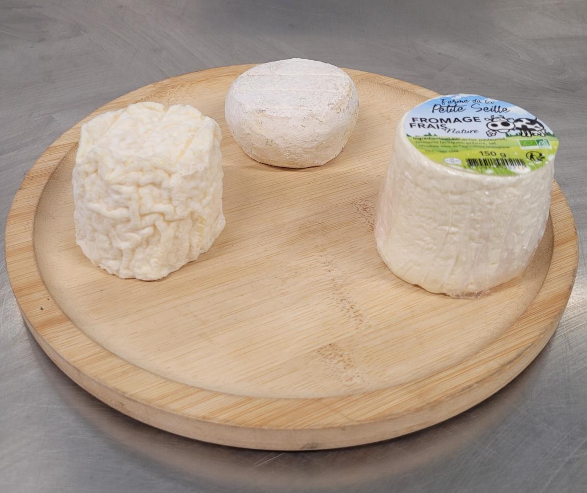 Lot de 3 petits fromages : un fromage frais nature, un Ptit Jeand (mini camembert) et un Ptit Saint Jean (fromage frais affiné)
